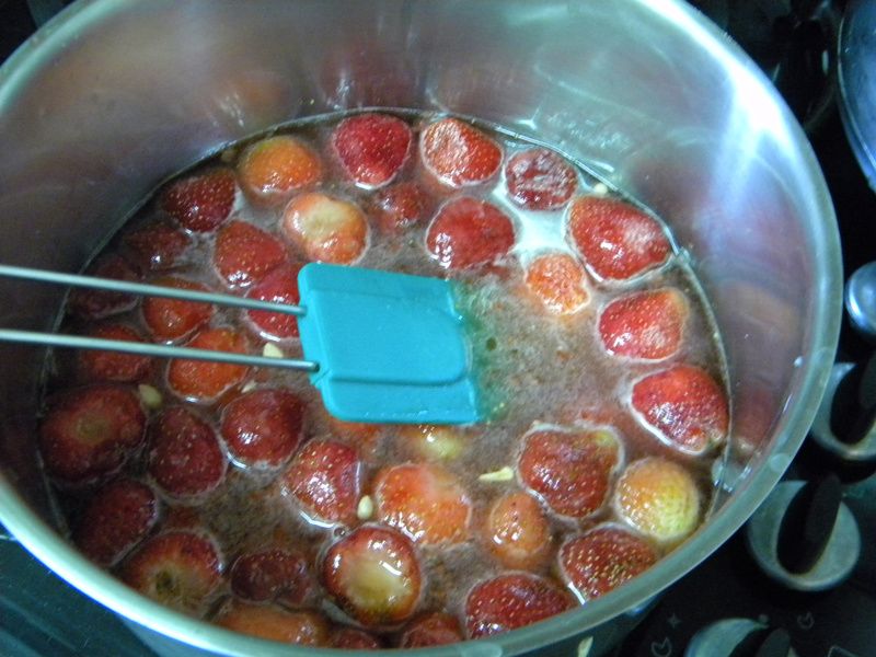 A ébullition de la pulpe, la verser en plusieurs fois sur les jaunes blanchis, remettre sur le feu et cuire à 85 degrés (crème anglaise) -